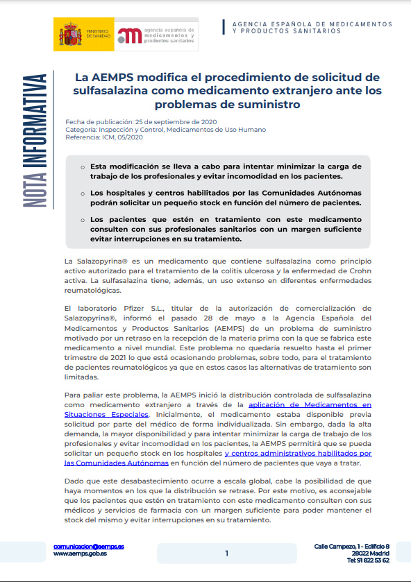 La Salazopyrina® es un medicamento que contiene sulfasalazina como principio activo autorizado para el tratamiento de la colitis ulcerosa y la enfermedad de Crohn activa. La sulfasalazina tiene, además, un uso extenso en diferentes enfermedades reumatológicas. El laboratorio Pfizer S.L., titular de la autorización de comercialización de Salazopyrina®, informó el pasado 28 de mayo a la Agencia Española del Medicamentos y Productos Sanitarios (AEMPS) de un problema de suministro motivado por un retraso en la recepción de la materia prima con la que se fabrica este medicamento a nivel mundial. Este problema no quedaría resuelto hasta el primer trimestre de 2021 lo que está ocasionando problemas, sobre todo, para el tratamiento de pacientes reumatológicos ya que en estos casos las alternativas de tratamiento son limitadas.